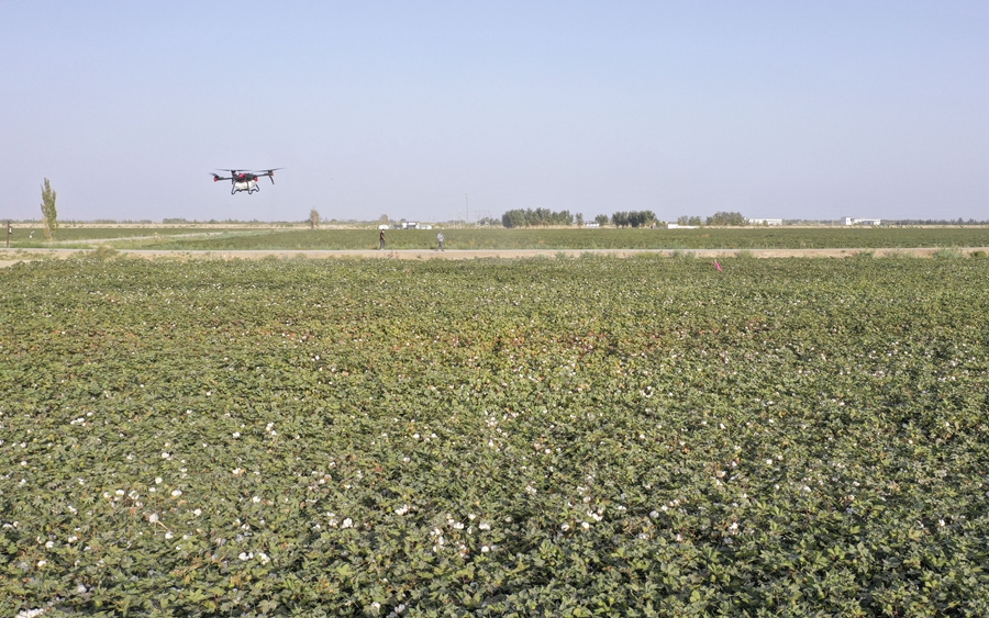 在新疆尉犁县兴平镇达西村一处高标准农田,种植户用无人机喷洒脱叶剂(2022年9月20日摄,无人机照片)。新华社发(汪志鹏 摄)