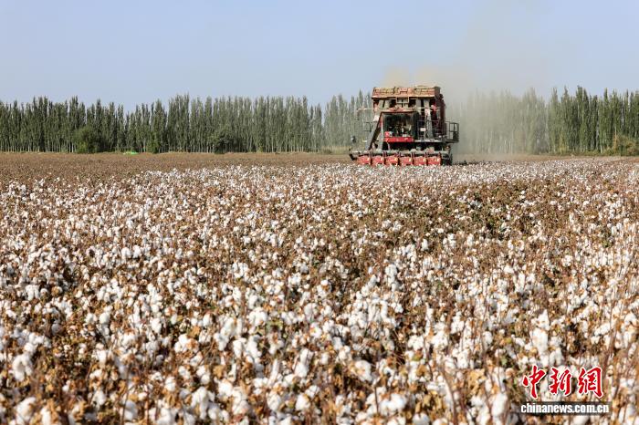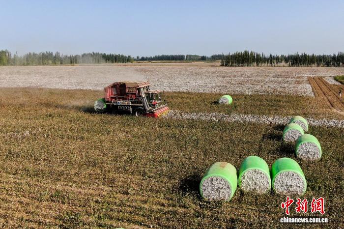 9月28日,新疆阿克苏地区阿瓦提县塔木托格拉克镇托万克塔木托格拉村种植的长绒棉进入采收季,采棉机在田地里采收并打包。中新社记者 张宇 摄