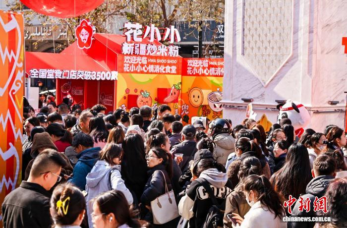 17日,记者在乌鲁木齐大巴扎步行街疆来城西广场看到,“米粉控”不断向此集结,品尝米粉的人排着长队,现场人气火爆。
