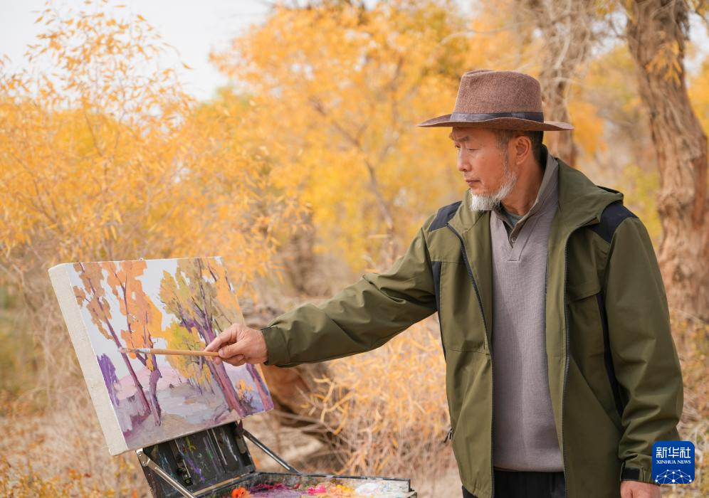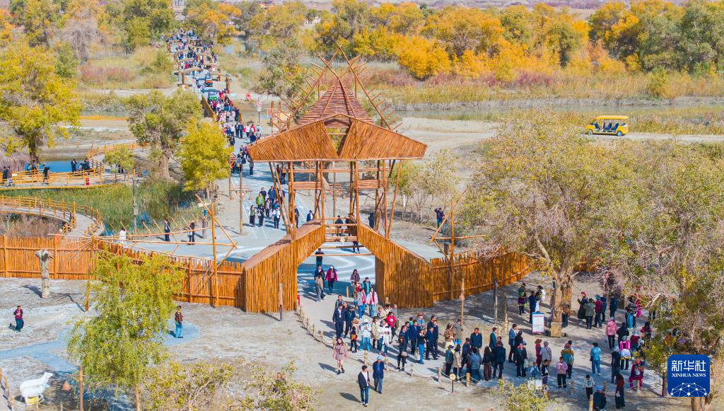金秋时节,新疆巴音郭楞蒙古自治州尉犁县境内的沙漠胡杨景观与塔里木河互相映衬,美不胜收,吸引不少游客观光游览。