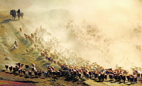 10月25日,哈巴河县牧民赶着羊群行走在转场路上。每年秋季,该县10万头(只)牲畜从春秋过渡牧场启程前往冬牧场越冬。 刘是何摄