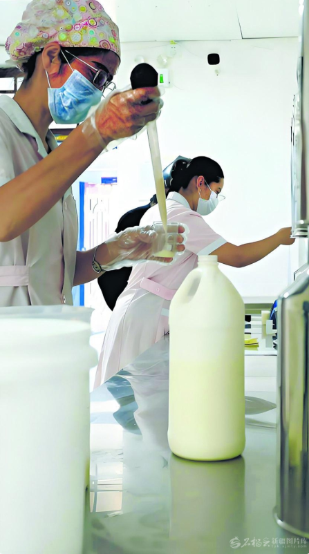 10月28日,吉木乃县阿塔尼乳业科技有限责任公司员工检验鲜牛奶。该公司生产的酸奶、奶酪、奶片等奶制品畅销全国。阿尔达克·拜斯汗摄
