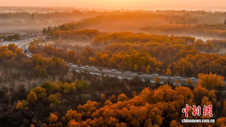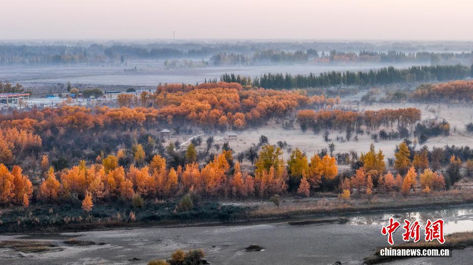 每年10月下旬至11月初,是新疆喀什地区莎车县叶尔羌河流域胡杨林最佳观赏期。金色胡杨与蓝天、碧水以及翩飞其间的鹭鸟构成一幅动人的生态画卷。(王世鑫 摄)