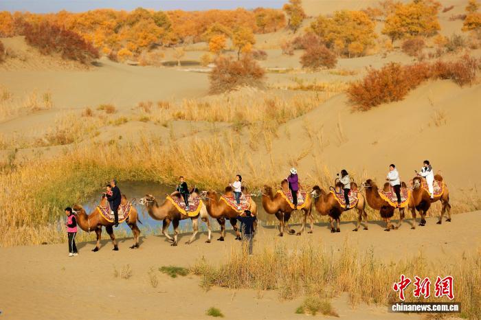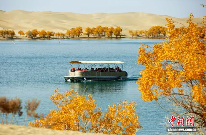 深秋时节,新疆南部胡杨林层林尽染,在尉犁县塔塔秘境罗布湖旅游度假区内,点缀在大漠中的金色胡杨吸引众多游客观赏。焦银辉 摄