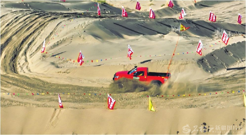 11月8日,参赛选手在博湖县艾勒逊乌拉沙漠里驾车驰骋。年磊摄