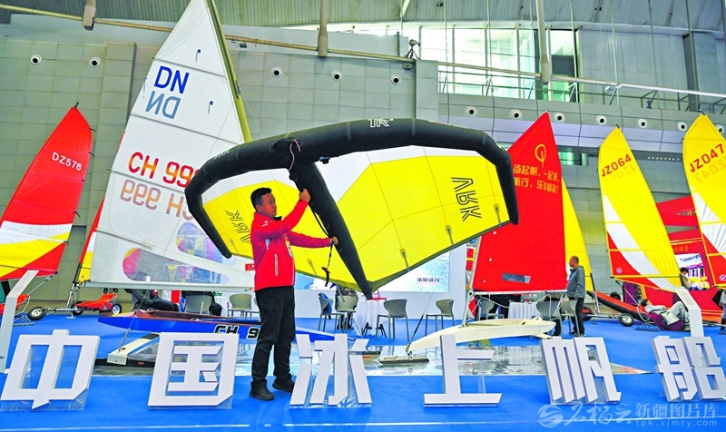 11月14日,参展商在中国冰上帆船展位整理展品。石榴云/新疆日报记者汤永摄