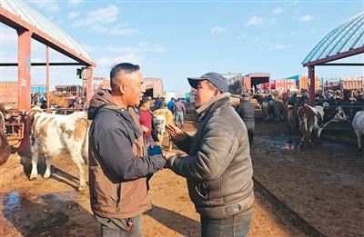 巨大的交易量,吸引了3000多名和马军一样的经纪人活跃在活畜交易市场。中午过后,黄公巴扎的牲畜交易接近尾声,停在巴扎内大大小小的货车开始装运牛羊了,马军将自己收购的40头牛装车拉回自家圈里,“等下个巴扎日收够了量就给客户发过去。”(记者/李亚楠)