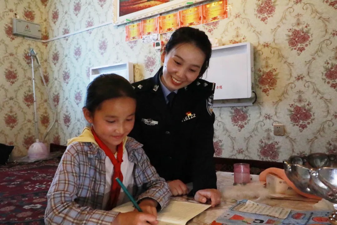 “西极爱心小分队”家访后了解到阿丽娜的家庭情况,民警沈美颖便成为这位柯尔克孜族姑娘的“知心姐姐”,多次到家中辅导功课,通过聊天谈心鼓励阿丽娜认真学习。