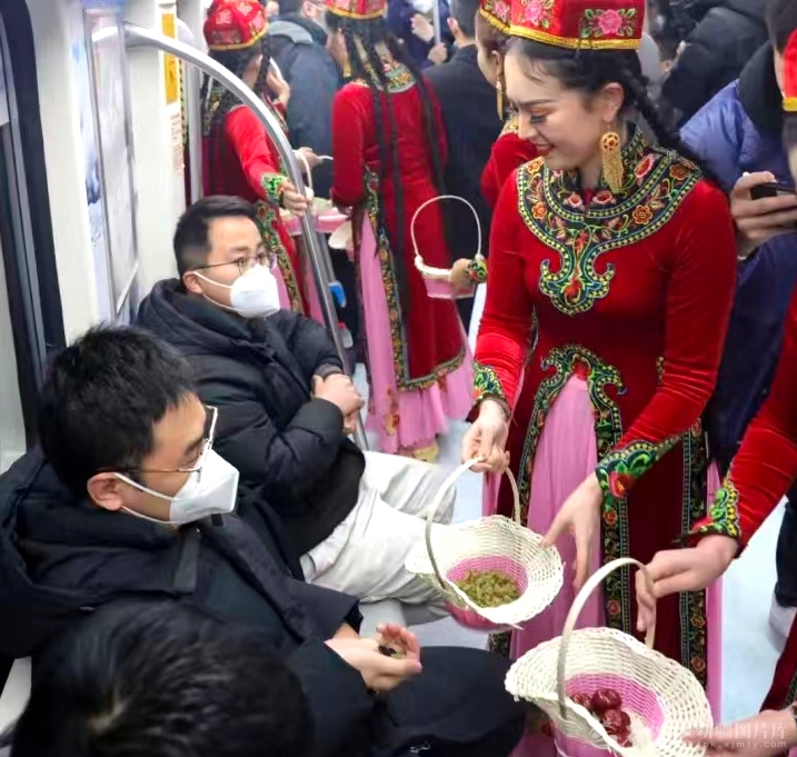 12月14日清晨,郑州市地铁紫荆山站人潮如织。一列印有“豫见新疆 甜美哈密”标语的“哈密号”地铁缓缓驶入站台。车厢内,东天山的皑皑积雪与大海道的雅丹地貌交相辉映,哈密瓜的金黄与葡萄干的绛紫点缀其间。刚上车的市民李女士掏出手机,对着“冰碴驹俐”的宣传海报扫码:“前几天在这买的哈密大枣特别甜,今天试试这个新疆羊肉。”