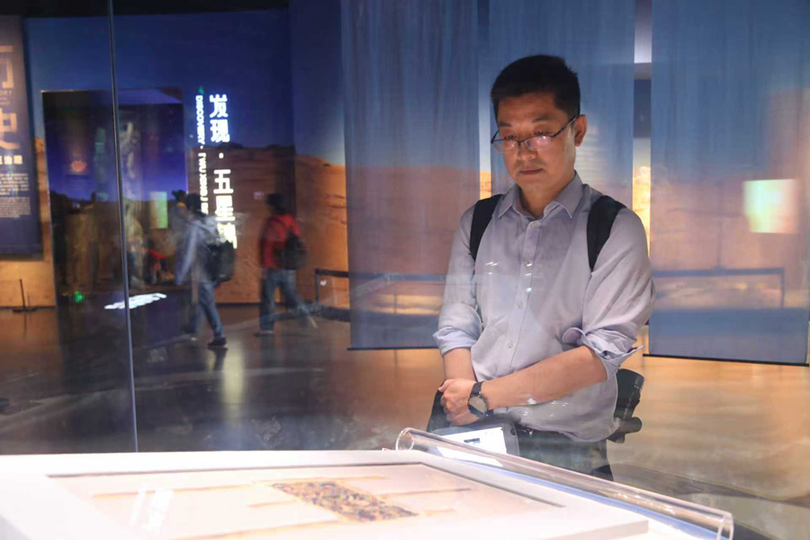 “我之前做研究时就对这件锦护臂有所了解,亲眼见到文物原件,心里有一种圆梦了的激动。”来自浙江大学的博士生纵浩然特意带着相机观展,记录下这件“国宝”。