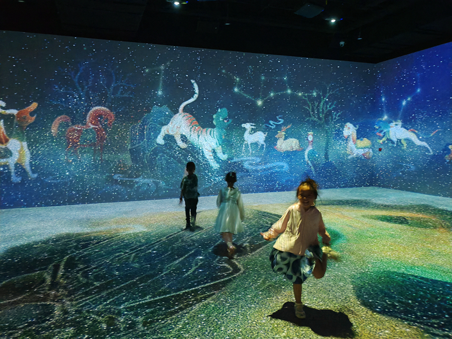 在“发现·五星锦”沉浸交互剧场,车队与驼铃声在月色下交织,五彩丝线串联起跨越时空的技艺与文明;而在“数字织机”前,观众通过操作屏幕上的拉杆与梭子,亲手将“虚拟丝线”织成绚丽的“数字五星锦”……