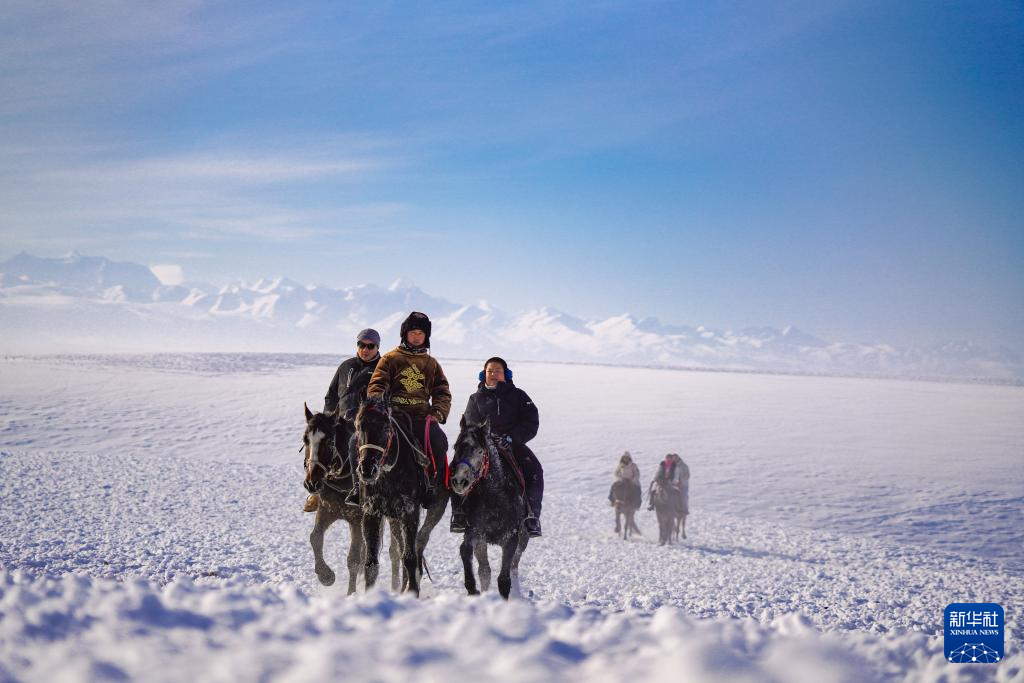 1月3日,游客(左一、左三)在新疆昭苏湿地公园体验骑马。新华社记者 徐宏岩 摄