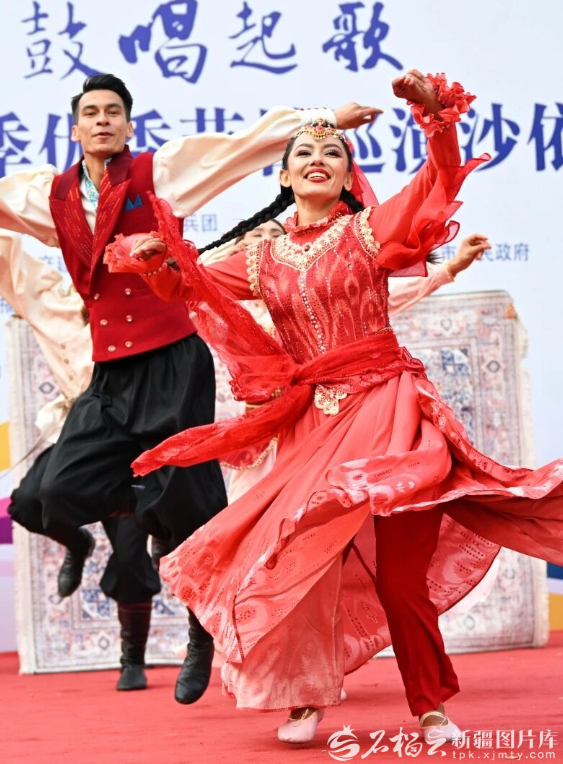 2025年10月23日,舞者们在乌鲁木齐市人民公园,表演“打起手鼓唱起歌”首届中国新疆民间艺术季优秀节目巡演作品之一——《地毯上的新娘》。迪丽娜尔·加力肯 摄
