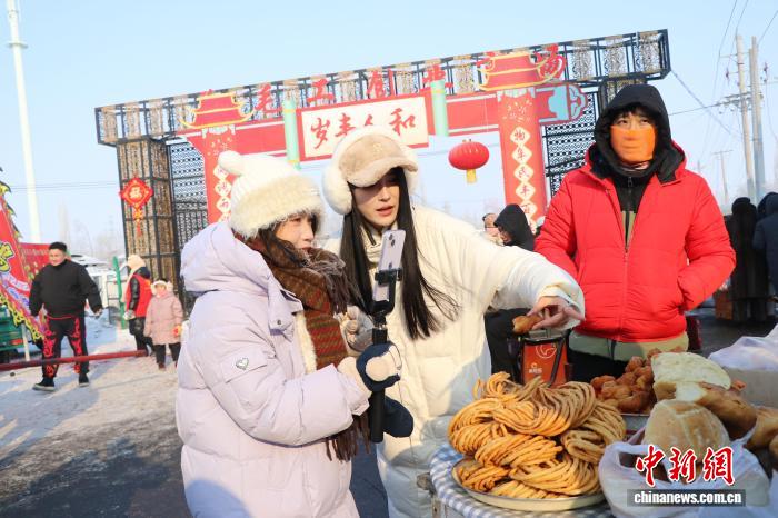 图为摊主向直播带货的博主介绍年货。苟继鹏 摄