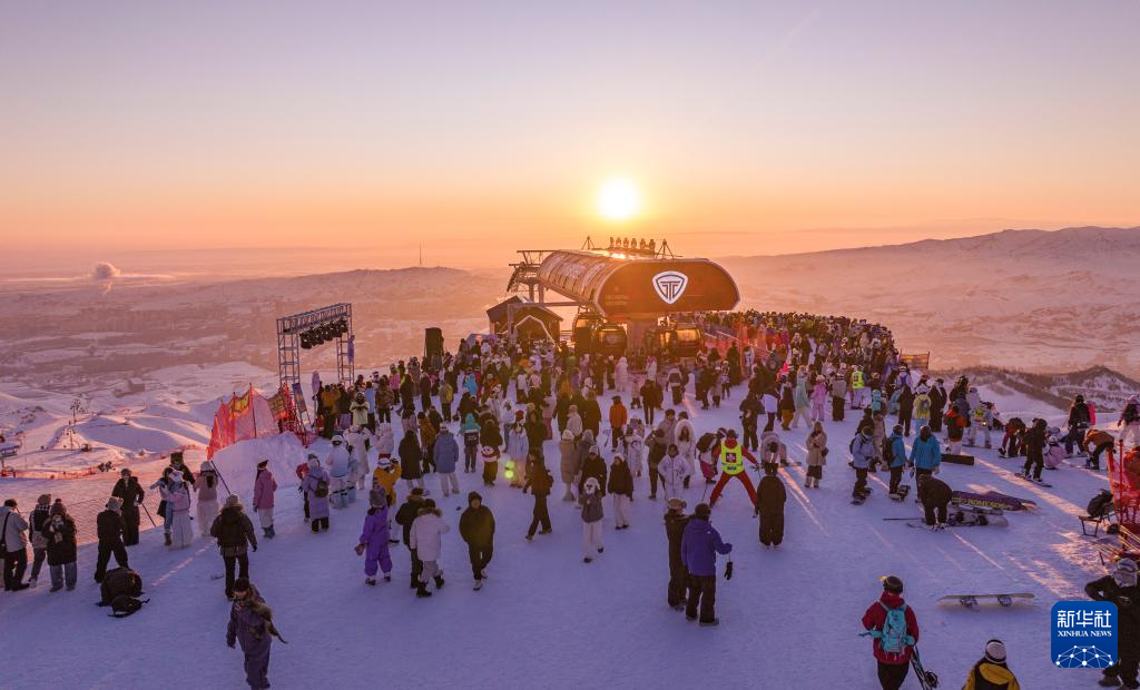 2月25日,滑雪爱好者在新疆阿勒泰将军山国际滑雪度假区参加“夕阳派对”。