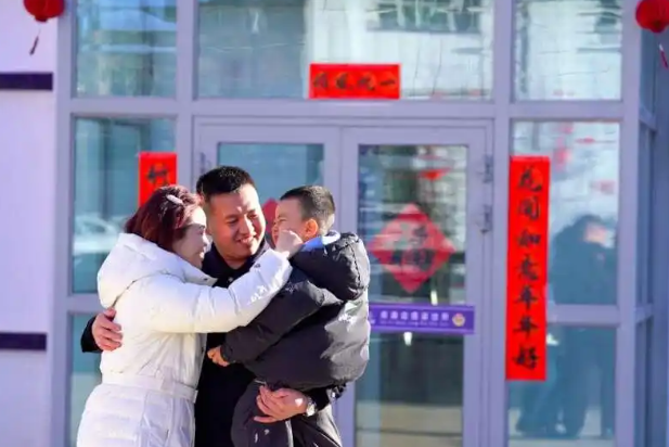 2月16日至18日,昌吉边境管理支队库甫边境派出所开展“千里探亲进警营 边关团圆贺新春”系列活动,民警家属跨越千里走进警营。图为民警陈欣伟(中)与爱人和儿子温情相拥。昌吉边境管理支队高梁珊/摄