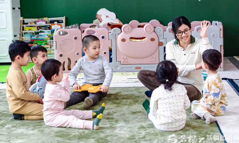 2月27日,老师在乌鲁木齐市天山区赛马场街道赛马场西社区邻里中心设立的亲子中心与小朋友玩耍。