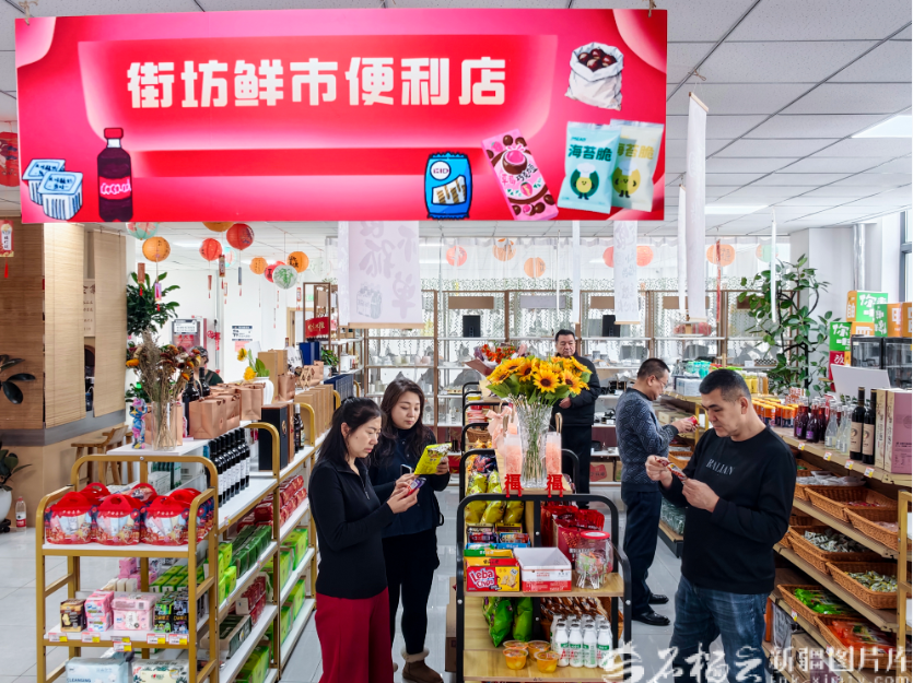 2月27日,居民在乌鲁木齐市天山区赛马场街道赛马场西社区邻里中心设立的超市购买物品。