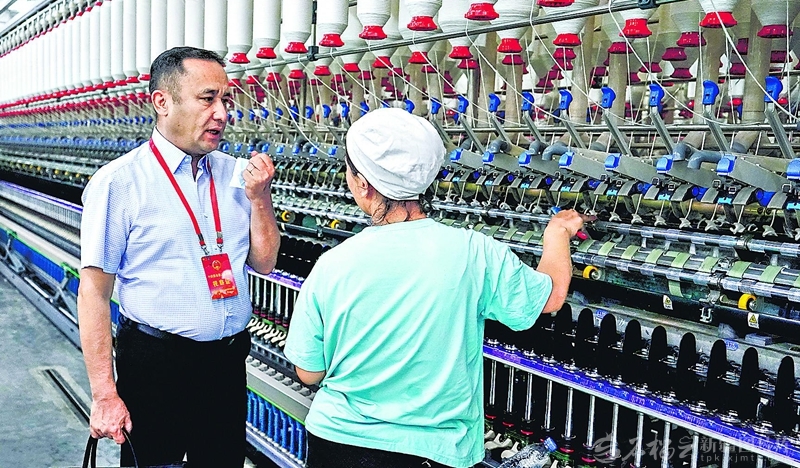 居来提·库尔班在若羌县一家棉纺企业生产车间调研(2025年5月24日摄)。图片由本人提供
