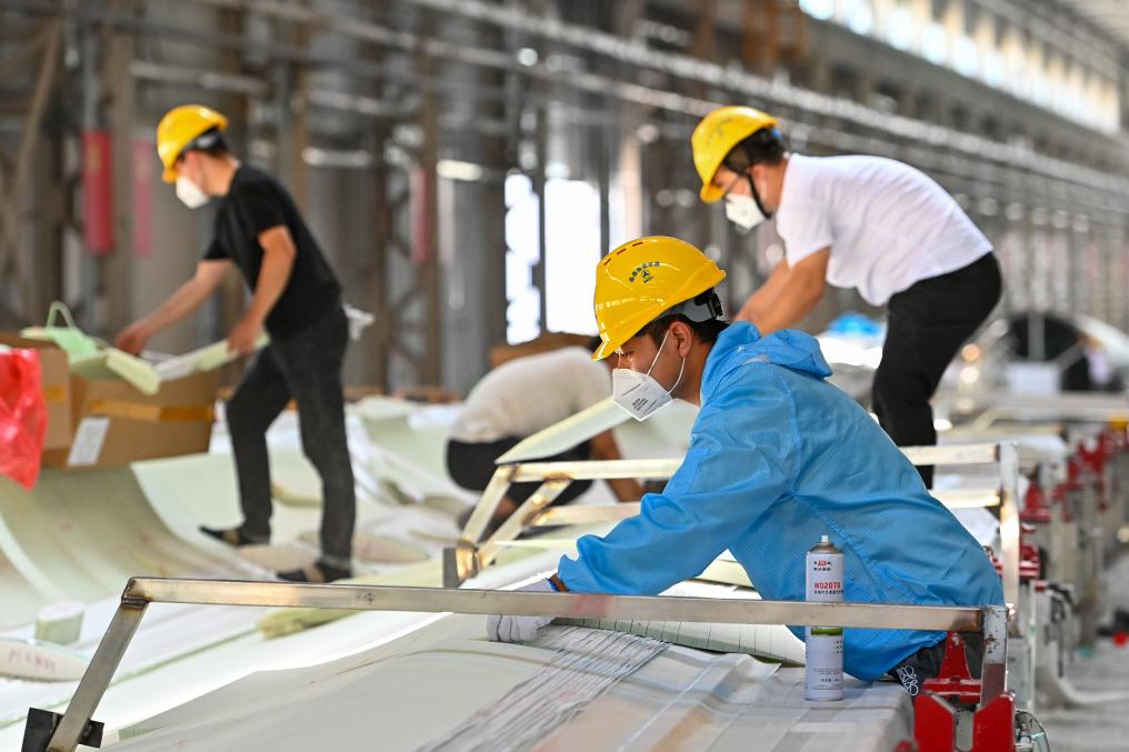 这是2023年7月22日拍摄的在新疆塔城重点开发开放试验区先行发展区三一(塔城)风电设备有限公司,工人在叶片成型车间忙碌。新华社记者丁磊 摄