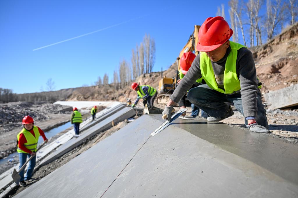 为防范应对可能出现的险情,新疆各地加强河道渠系疏通和水情监测。记者在伊犁哈萨克自治州伊宁市潘津镇苏拉宫村的苏勒萨依山洪沟看到,两台挖掘机正在紧张作业,对山沟内淤泥、杂物等进行全面清理,保障行洪通畅。