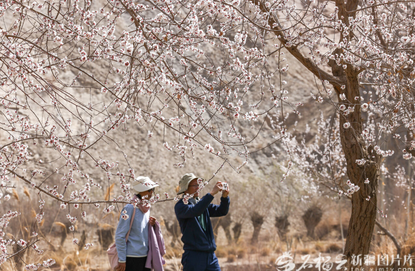 连日来,洛浦县千山河谷旅游景区杏花盛放。图为3月29日,广东游客前来打卡赏花。许晓龙摄