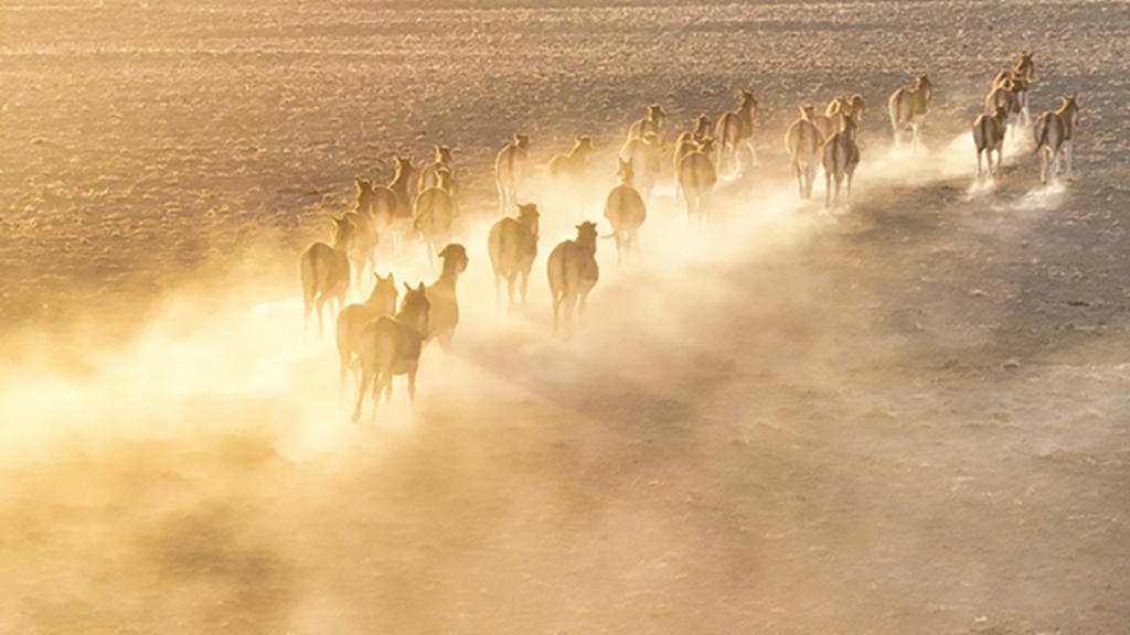 “快看,藏野驴!”驾驶员指着车窗右侧方向惊呼。原以为到了高原深处才能见到野生动物,没想到“幸福”来得这么突然。当阿雅克库木湖海天一线的景象在眼前逐渐清晰时,我们看到一群藏野驴在路旁疾驰,尘土飞扬。