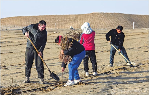 初冬时节,在于田县万花园防沙治沙示范区,一株株玫瑰幼苗在风中摇曳。这里位于塔克拉玛干沙漠南缘,放眼望去,四周的玫瑰、酸枣、开心果等经济作物正深深扎根沙地,倔强地向着广袤无垠的沙漠挺进。