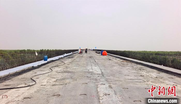 中新网新疆图木舒克6月5日电 (史玉江)4日18时许,新疆生产建设兵团第三师图木舒克市至第十四师昆玉市沙漠公路(下称图昆公路)三师段第二标段叶尔羌特大桥整体框架结构已基本完成。中新网记者现场看到,叶尔羌特大桥仿佛一条飞龙,从望不到边的胡杨林上空穿过,工作人员正在桥面上紧张有序地忙碌着。