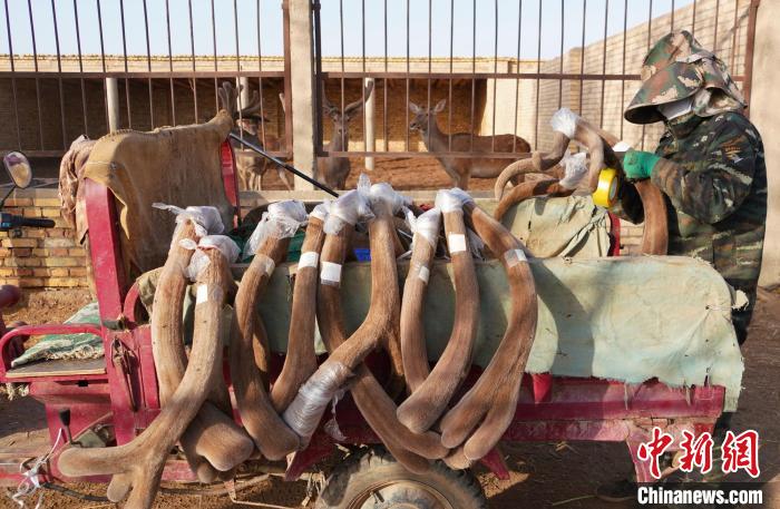 中新网乌鲁木齐7月1日电 (史玉江 史瑞霞)夏至以来,地处塔里木盆地的塔河马鹿正处于采茸旺期。日前,记者在位于新疆兵团第二师三十四团的铁门关市兴顺源畜牧养殖农民专业合作社看到,来自中国农业科学院特产研究所的博士杨苏坤和同事正在对鹿茸进行测量、称重登记。