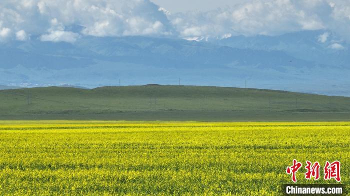 7月,昭苏县万亩油菜花海飘香、蜂飞蝶舞,连片的油菜花田犹如一条金色花毯,与远处的天山遥相辉映,梦境般的美景让游客沉醉其中。吸引了大批游客纷纷前来踏花赏景,拍照游玩,亲近自然。