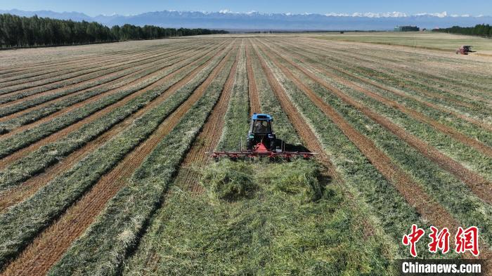近日,新疆昭苏县近万亩饲用燕麦草进入了收获期。田间地头,成片燕麦青草一望无垠,一辆辆收割机穿梭田间、忙碌作业,一派热闹丰收景象,这些燕麦草将成为牲畜优质的“口粮”。在昭苏县昭苏马场田地里,伴随着收割机、搂草机、打捆机的阵阵轰鸣,燕麦草收割作业正式拉开帷幕,收割、晾晒、打捆有序进行,确保颗粒归仓、寸草归垛,大型农机具不但节约了人力,还保证了作物高效收获。据了解,燕麦草营养价值高,是一种优质牧草。昭苏县地势平坦,昼夜温差大,十分适合燕麦草的生长。今年,马场不断扩大土地流转面积,并通过精细化管理和机械化作业,提升了燕麦草品质,燕麦草产业也成为昭苏又一个绿色支柱产业,为牲畜越冬度春提供坚实的物资保障,确保畜牧业生产持续稳定健康发展。