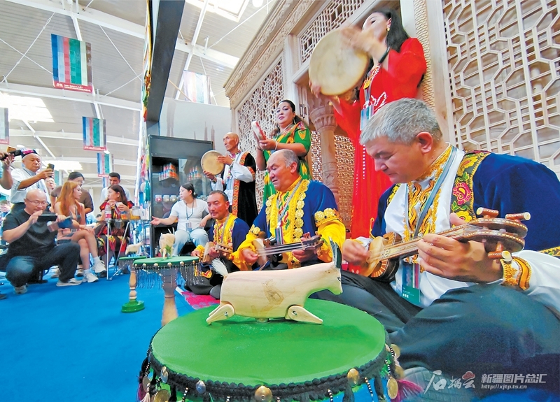 8月23日,观众在2023“新疆是个好地方”对口援疆19省市非物质文化遗产展和田展台前观看非遗项目“木山羊舞”展演。石榴云/新疆日报记者邹懿摄