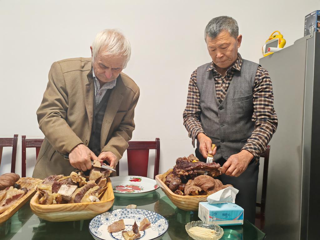 11月9日,新疆塔城地区额敏县榆柳巷居民库吾尔鲁西·吾斯曼(左)与邻居林忠东(右)在家中剔肉。新华社记者苟立锋 摄