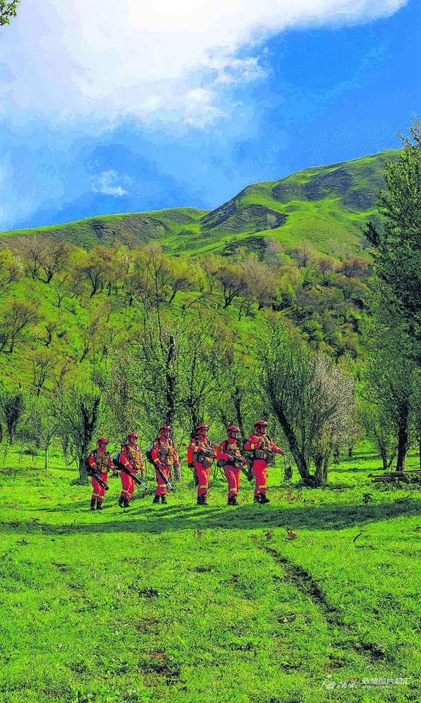 4月22日,消防员在林区巡护。随着伊犁河谷气温逐渐回升,为做好春季防火工作,伊犁哈萨克自治州新源国有林管理局森林消防专业应急分队选派灭火经验丰富的消防员携带灭火装备深入林区巡查,确保森林消防安全。 张文庭摄