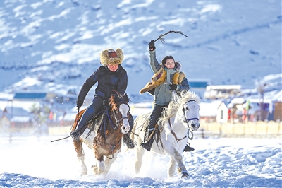 2023年12月22日,在阿勒泰地区富蕴县可可托海镇塔拉特村,村民为游客表演“姑娘追”。 新华社记者 丁磊摄
