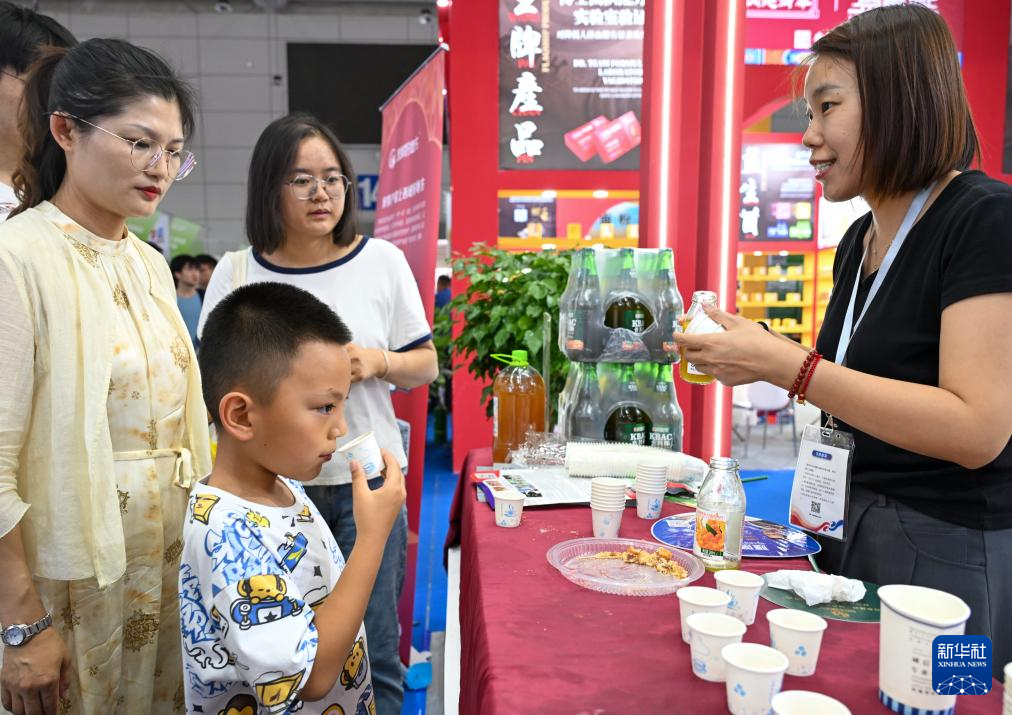 6月30日,在第八届中国——亚欧博览会上,小朋友在品尝一款新疆生产的沙棘饮料。(新华社记者 陈朔 摄)