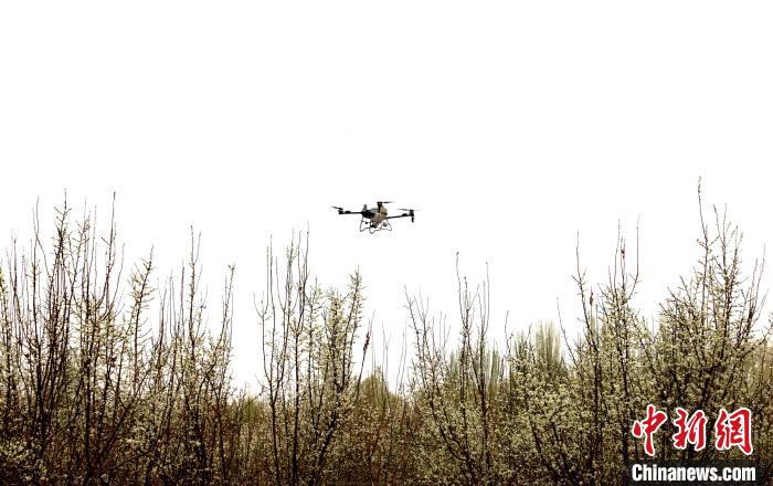 无人机为杏花授粉。杨力荧 摄