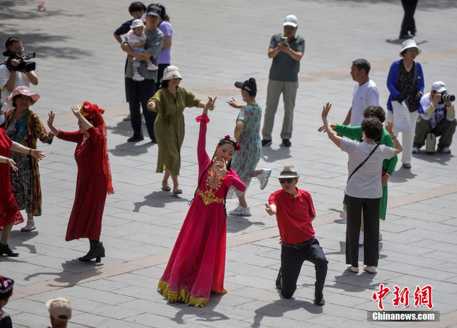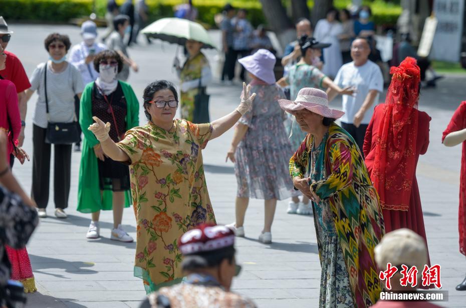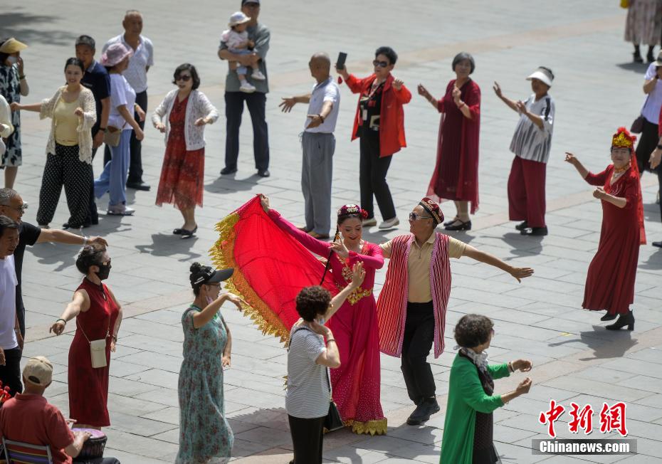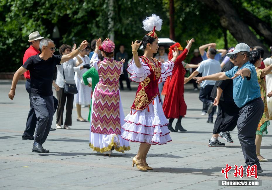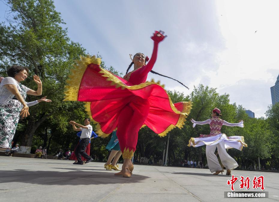 6月5日,新疆乌鲁木齐市人民公园,民众跳起欢快的民族舞蹈,参与舞蹈快闪活动,迎接古尔邦节到来。(中新社记者 刘新 摄)