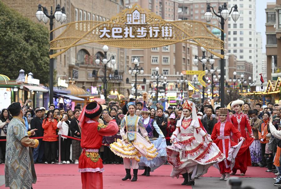 Attendees of the 6th World Media Summit watch performance at the grand bazaar in Urumqi, northwest China's Xinjiang Uygur Autonomous Region, Oct. 16, 2024. (Xinhua/Hu Huhu)