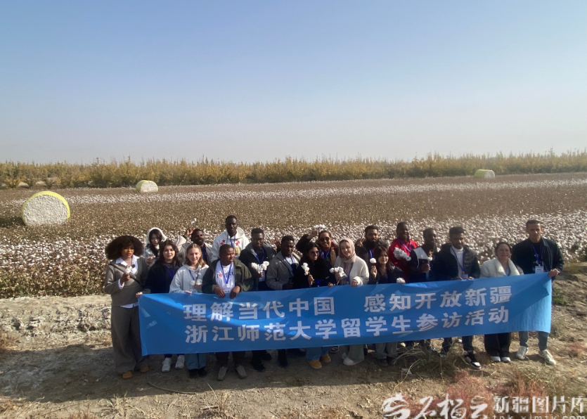 10月24日,留学生在绿洲农场的棉田边合影。天山网-新疆日报记者 沈祖孝摄