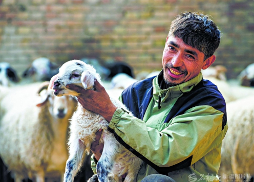 10月30日,牧民亚库甫江·玉苏甫江抱着刚出生的羊羔,脸上洋溢着笑容。近日,博乐市乌图布拉格镇恰尔根浩图呼儿村养殖的多胎湖羊迎来秋羔生产季。 楠登摄