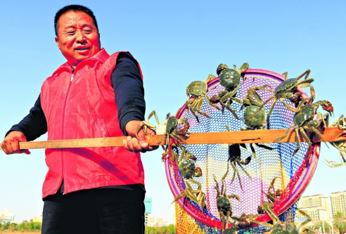 10月28日,库车市南湖水产养殖基地,渔民展示自己养殖的中华绒螯蟹,乐享丰收喜悦。 刘鼎摄