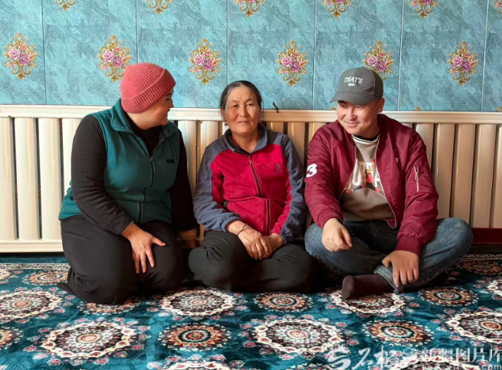 10月23日,朱丽德孜·叶尔兰(左)和婆婆吾木提古丽以及丈夫一起闲聊。记者 白素君 摄