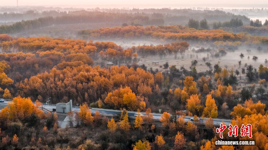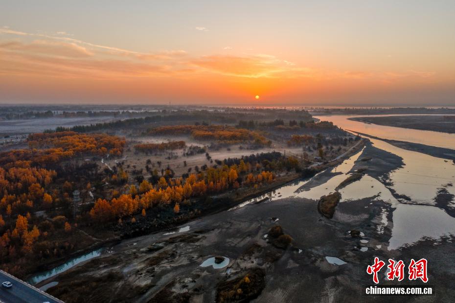 每年10月下旬至11月初,是新疆喀什地区莎车县叶尔羌河流域胡杨林最佳观赏期。金色胡杨与蓝天、碧水以及翩飞其间的鹭鸟构成一幅动人的生态画卷。(王世鑫 摄)