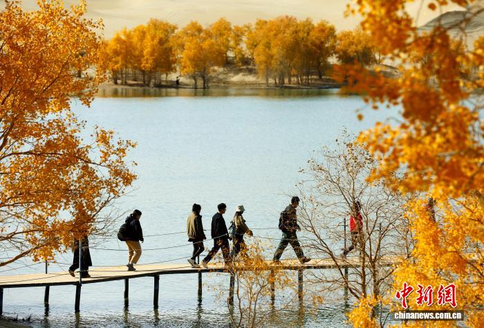深秋时节,新疆南部胡杨林层林尽染,在尉犁县塔塔秘境罗布湖旅游度假区内,点缀在大漠中的金色胡杨吸引众多游客观赏。焦银辉 摄