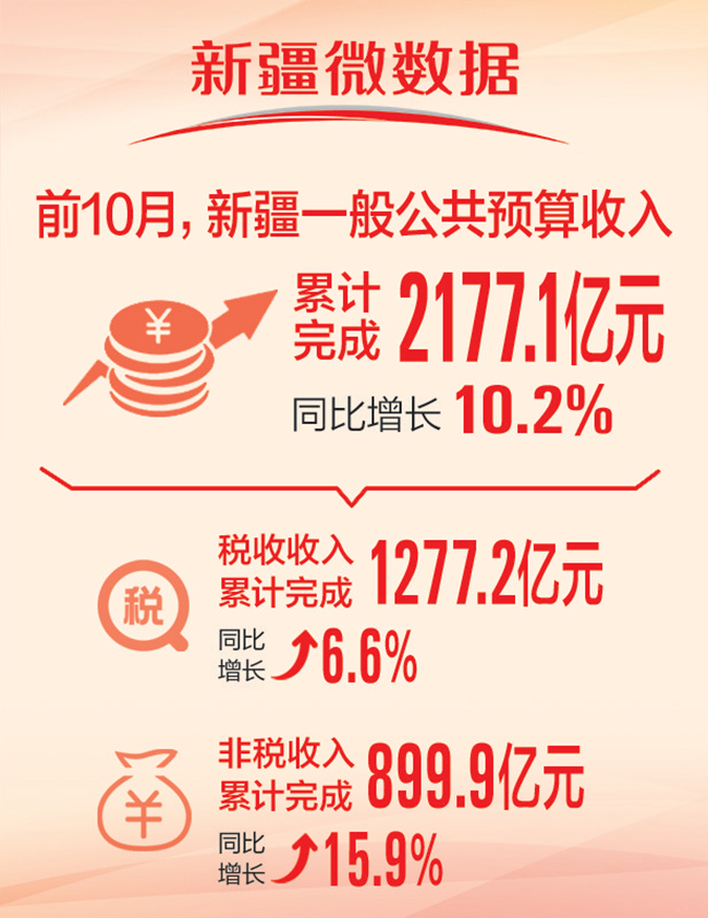 石榴云/新疆日报记者冉虎报道:前10月,新疆财政运行平稳向好。一般公共预算收入累计完成2177.1亿元,同比增长10.2%;一般公共预算支出累计完成5525.7亿元,同比增长7.7%,收支增幅均位居全国第三。