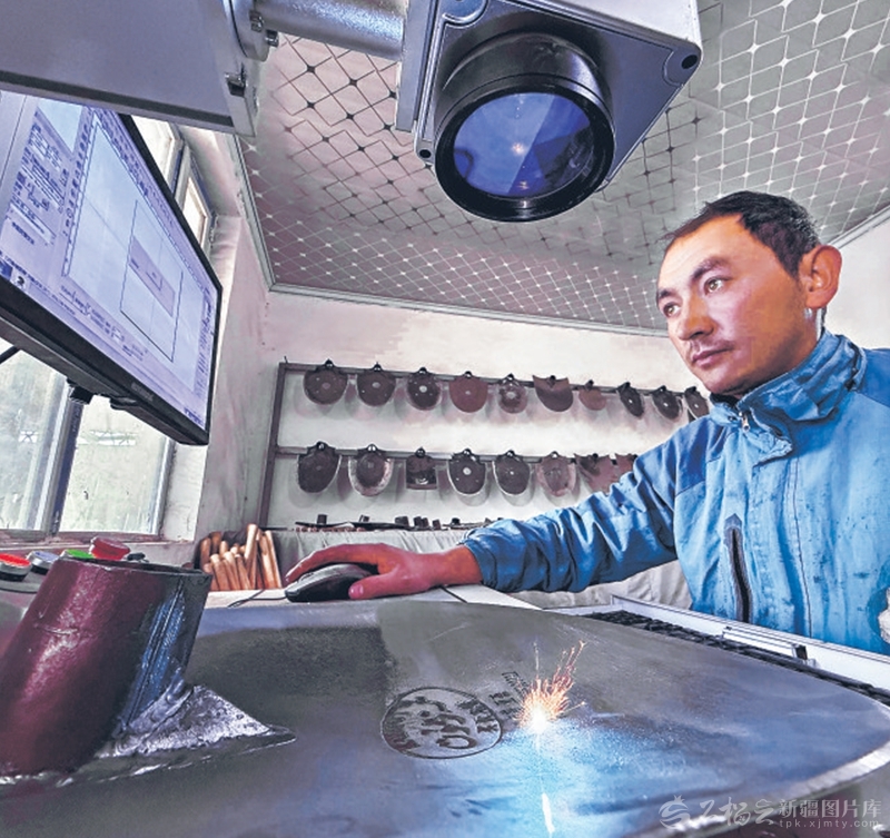 12月2日,艾买提·亚森的徒弟为制作好的坎土曼刻制标识。