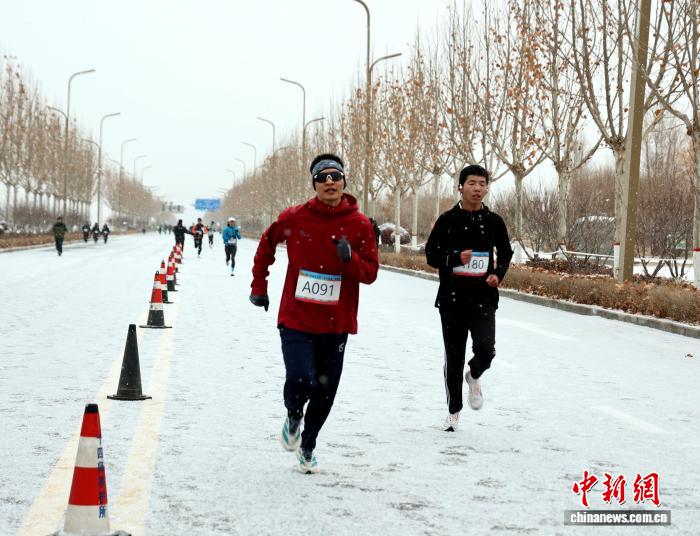 2026年元旦,新疆生产建设兵团第十四师昆玉市在奥林匹克生态体育公园举办“迎新年·奔向新征程”全民健身健康跑活动。当日,在雪花纷飞的跑道上,400余名跑步爱好者以奔跑的姿态迎接新年第一场雪。张芳军 摄