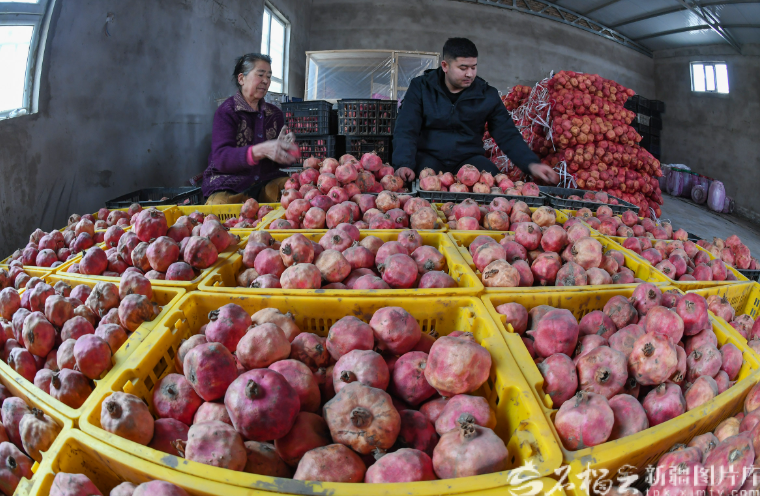 2月7日,策勒县策勒镇石榴籽村村民在分拣石榴。